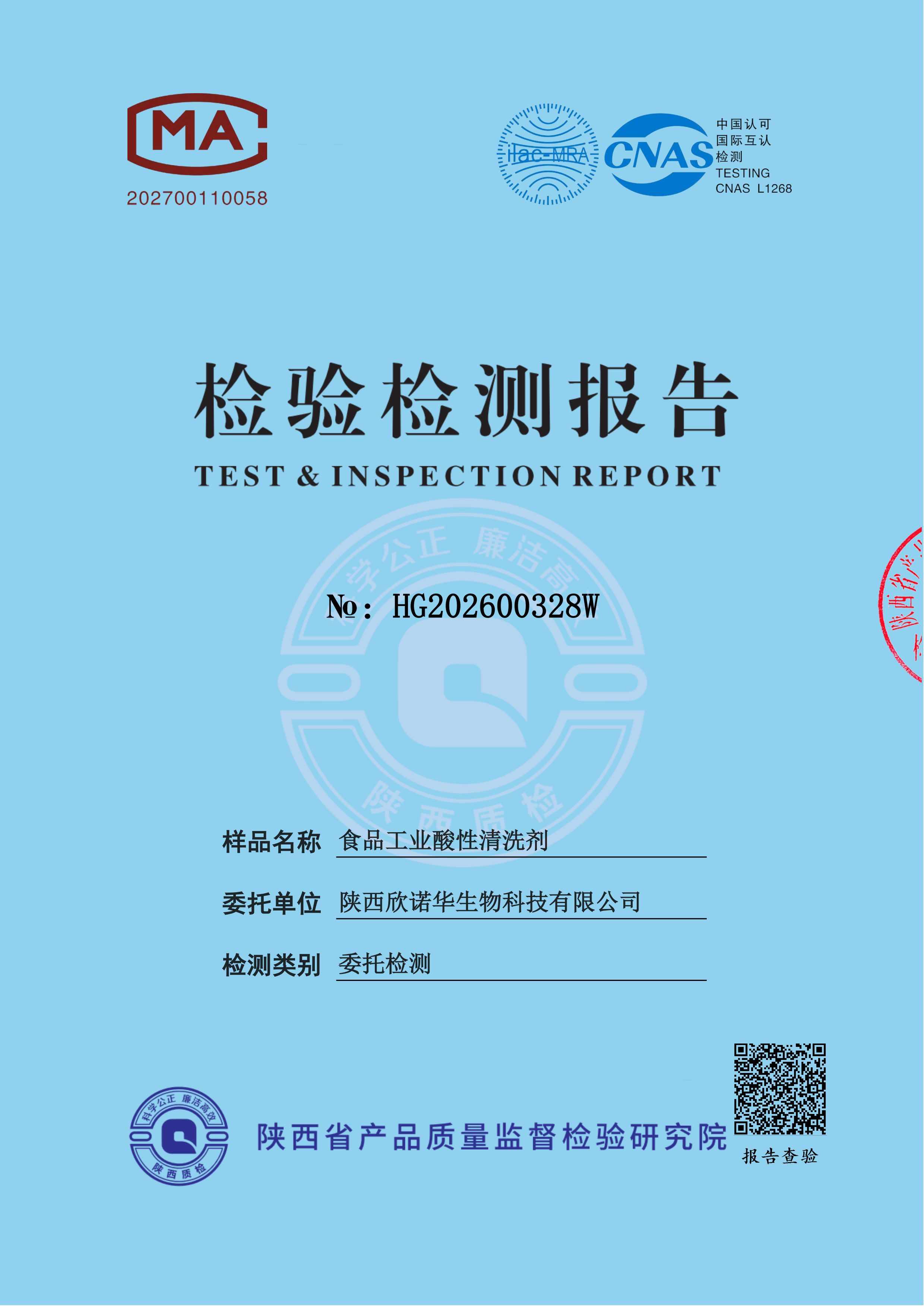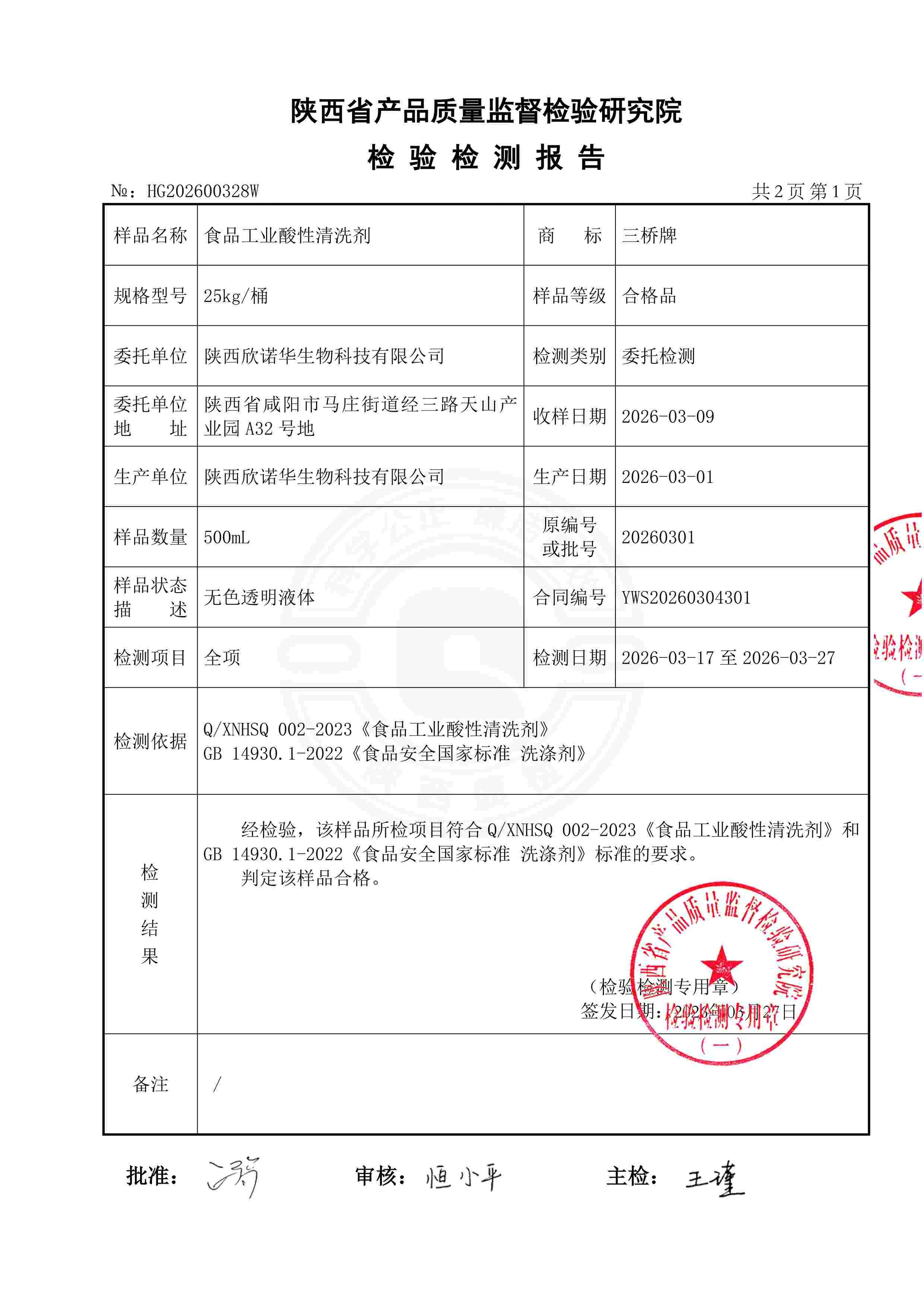 三橋牌食品工業(yè)酸性清洗劑檢測報告(2026年度)-陜西欣諾華生物科技有限公司